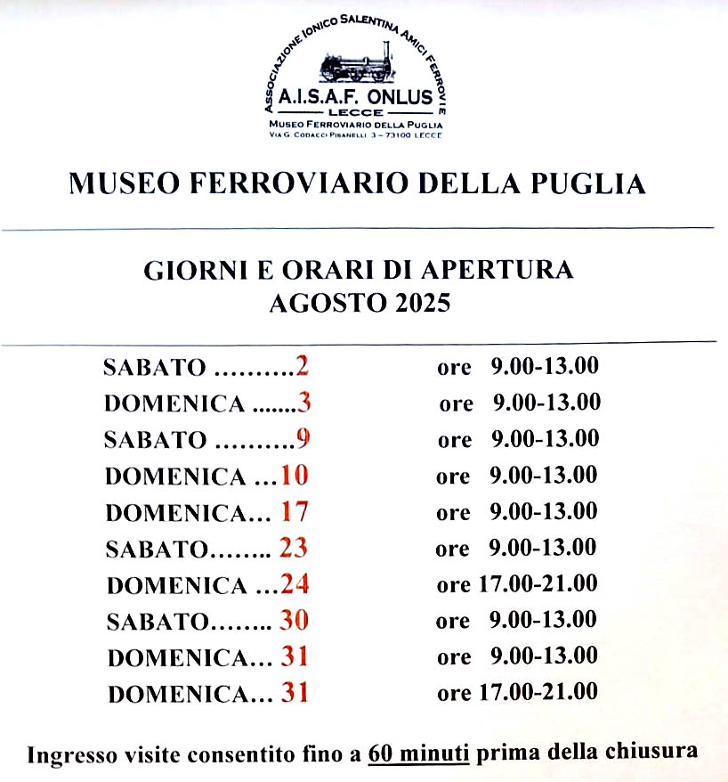 The Railway Museum of Puglia belongs to the municipality of Lecce and is managed by AISAF Onlus (Associazione Ionico Salentina Amici Ferrovie) which is a non-profit organization that pursues the public appreciation of rail transport through the dissemination of information about railway history and reality.